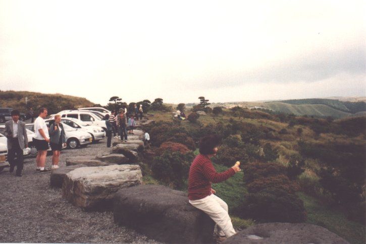 Auf dem Weg zum Aso halten wir erstmals an einem Aussichtspunkt von wo man das ganze Gebiet überschauen kann. Nachdem wir uns ein wenig umgesehen und einen Maiskolben gegessen haben ( ich frage mich immer wieder warum man zu den Maiskolben keine Zahnstocher bekommt, so als kleines Geschenk oder aber auch zu kaufen. He, ihr Maiskolbenverkäufer aller Länder, Ihr macht da einen Fehler. Ihr könntet mehr verdienen. Laßt Euch das einmal durch den Kopf gehen.) fahren wir zu einem Vulkanmuseum. Hier gibt es einiges zu sehen. Informationen über die Entstehung von Vulkanen, verschiedenste Gesteinsarten und außerdem noch einige Tiere die hier in der Region leben. Ja, und noch Horden von Schülergruppen ( Gruß an Dag). Man könnte glauben das die japanischen Schüler nur unterwegs sind. Von einer Sehenswürdigkeit zur anderen. Auf jeden Fall haben wir immer welche gesehen. Nur was wir nicht gesehen haben, oder nicht so richtig , war der Berg Aso. Zumindest kann sagen das die Japaner viel Nebel bzw. Wolken haben. Davon haben wir genügend gesehen. Da es auch nicht so warm war kauften wir uns ein paar heiße Getränke, aus dem Automaten, jawohl. Hier gab es die verschiedensten Kaffe- oder Teegetränke in Dosen, und sogar Heiß. Warum gibt es so was nicht bei uns, he, warum nicht.